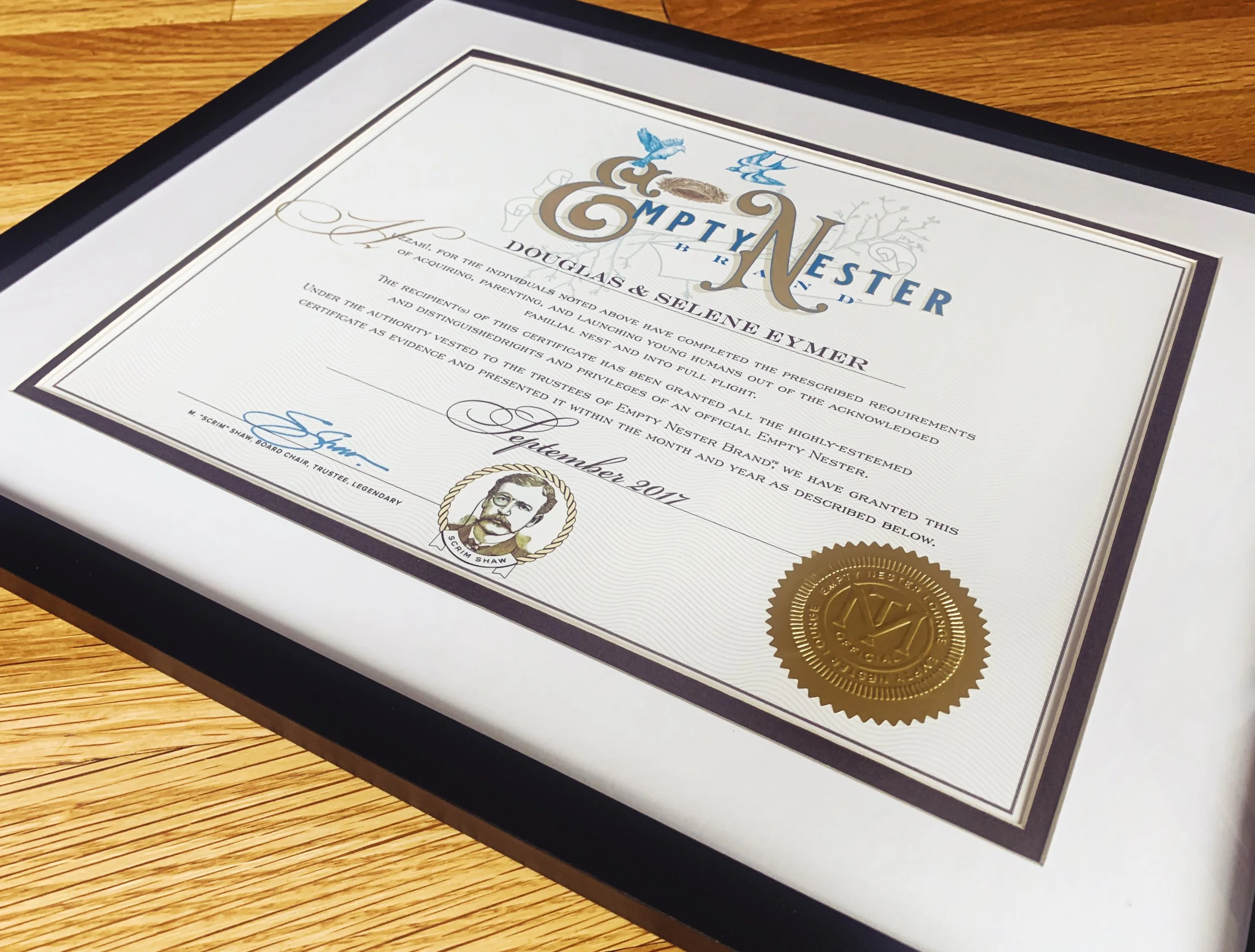 The couple has designed an official EMPTY NESTER certificate to recognize this noteworthy achievement. Each intricately designed certificate is personalized with the name(s) of the joyous parental unit(s) and the date of the successful flight. The 8.5"x11.0" document is also available, either framed or unframed.